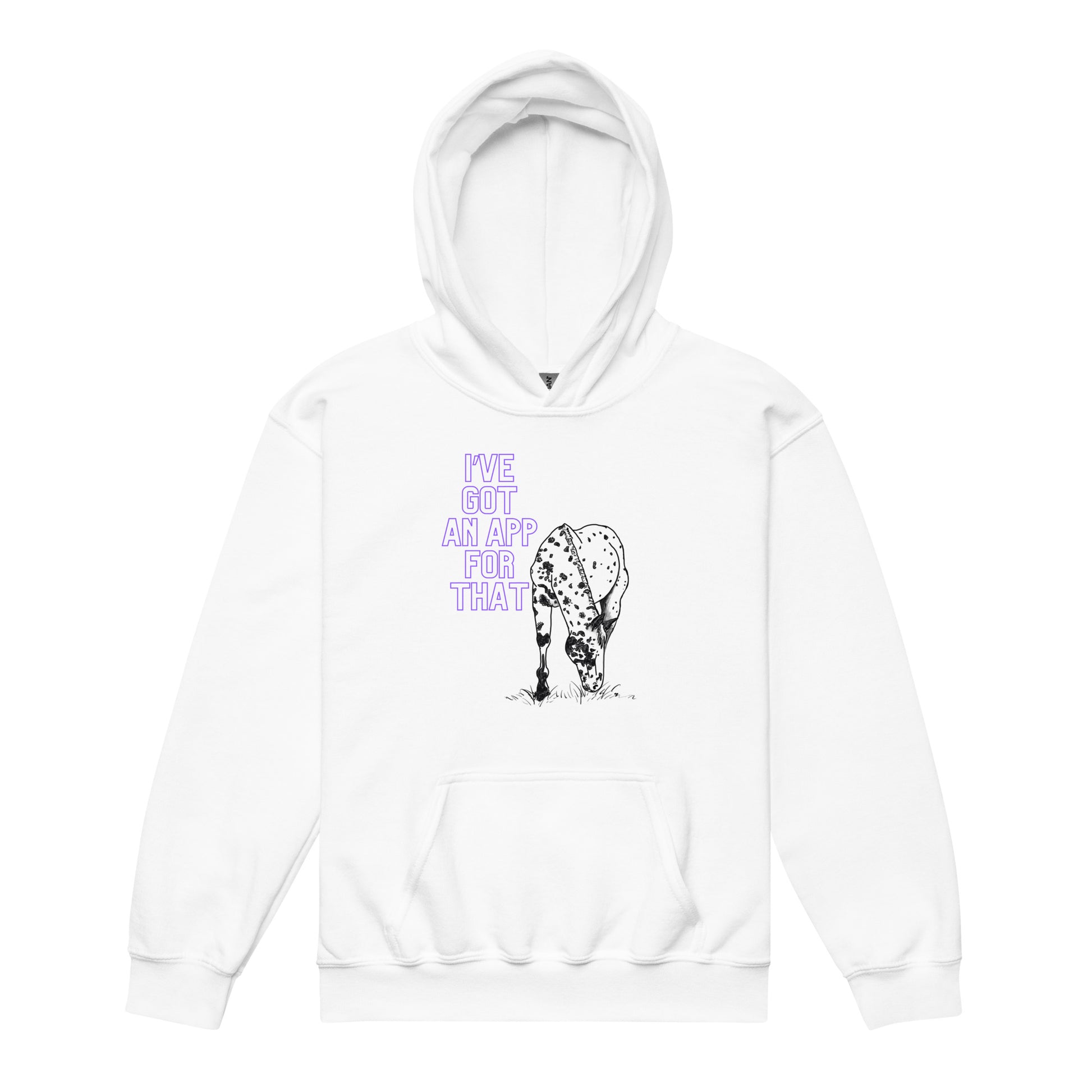 Durable, cotton blend hoodie with our beloved resident appaloosa, Dixie on the front! Our I've got an App for that hoodie is a super fun way for youth to sport one of our favorite horse breeds wherever they go!