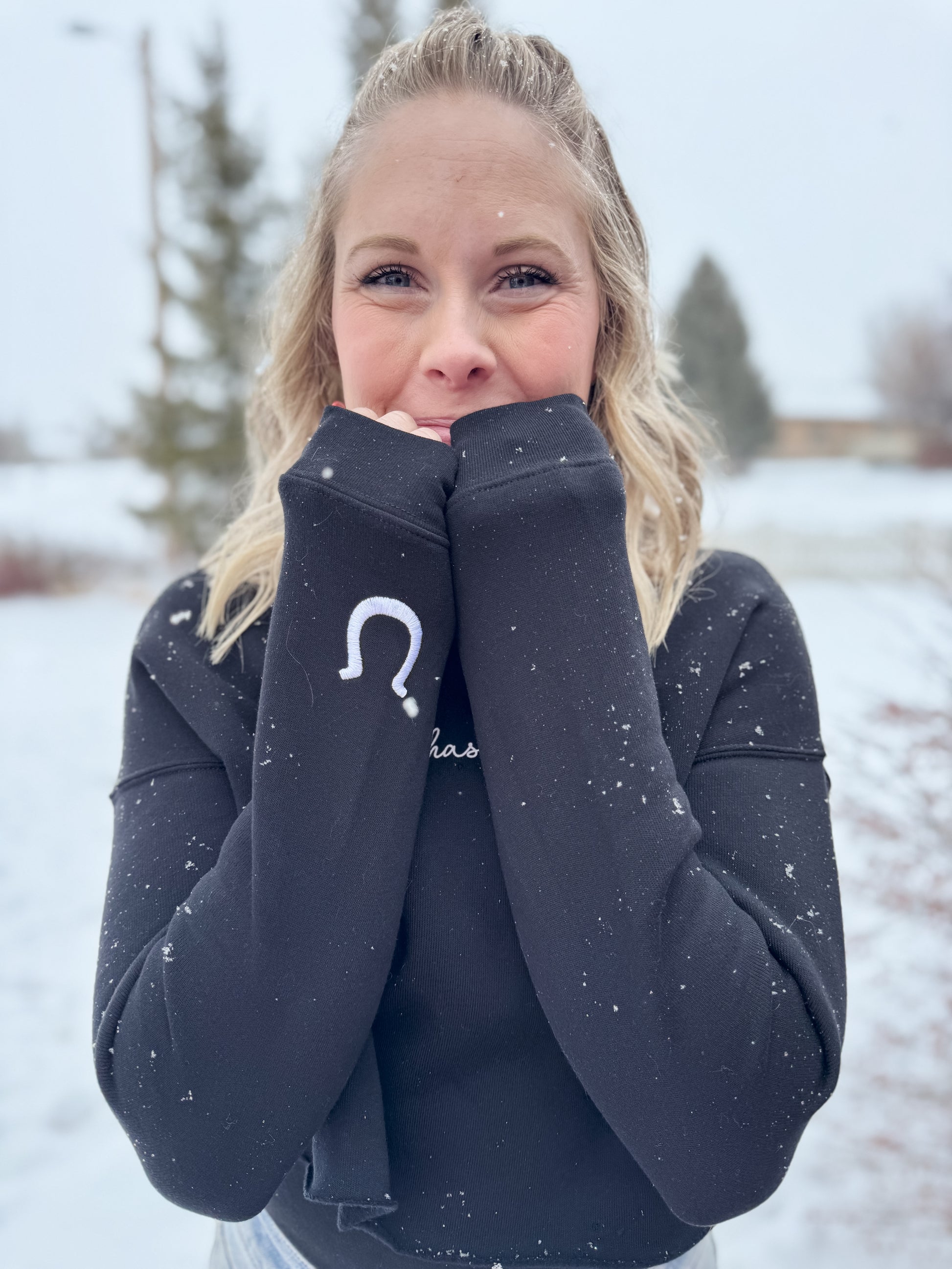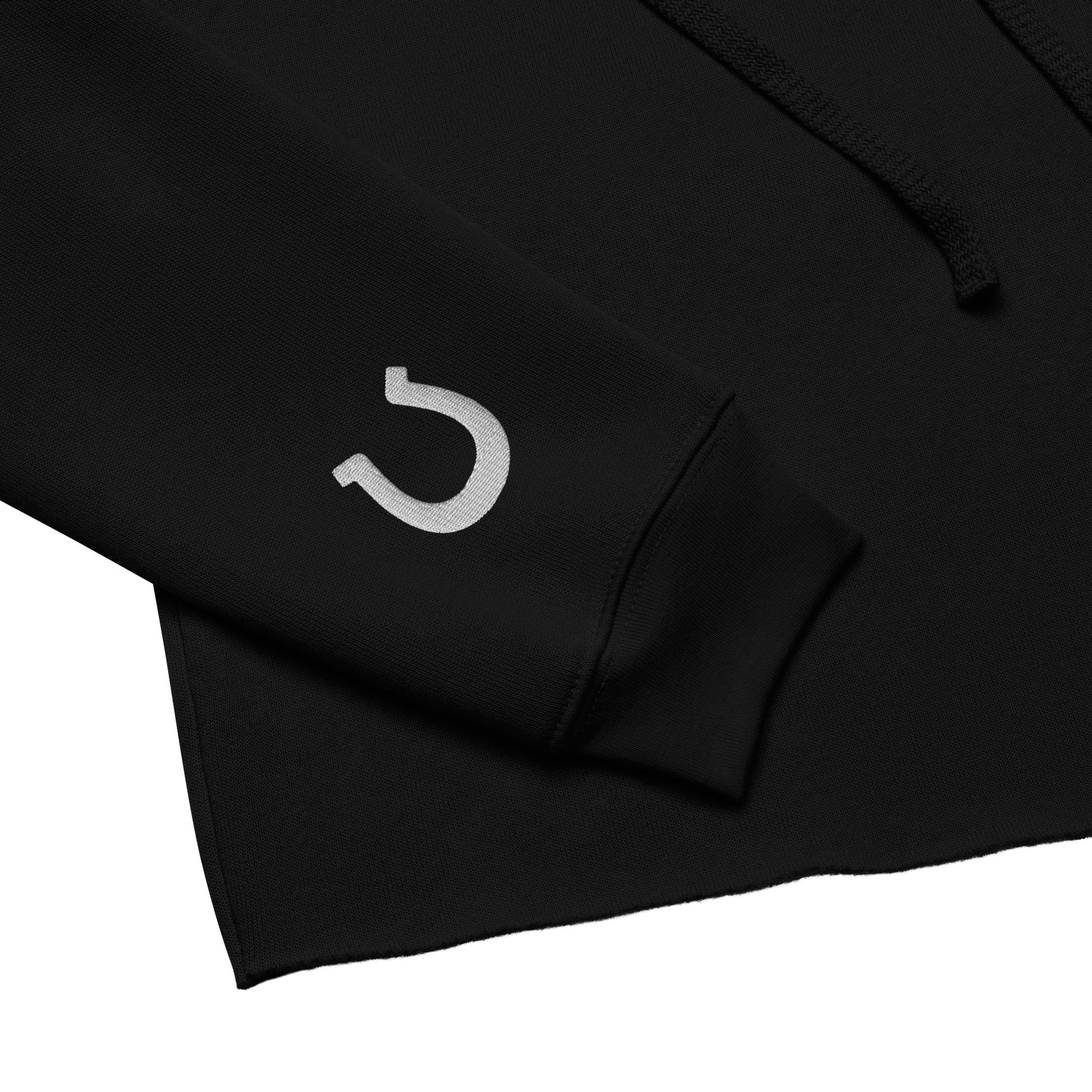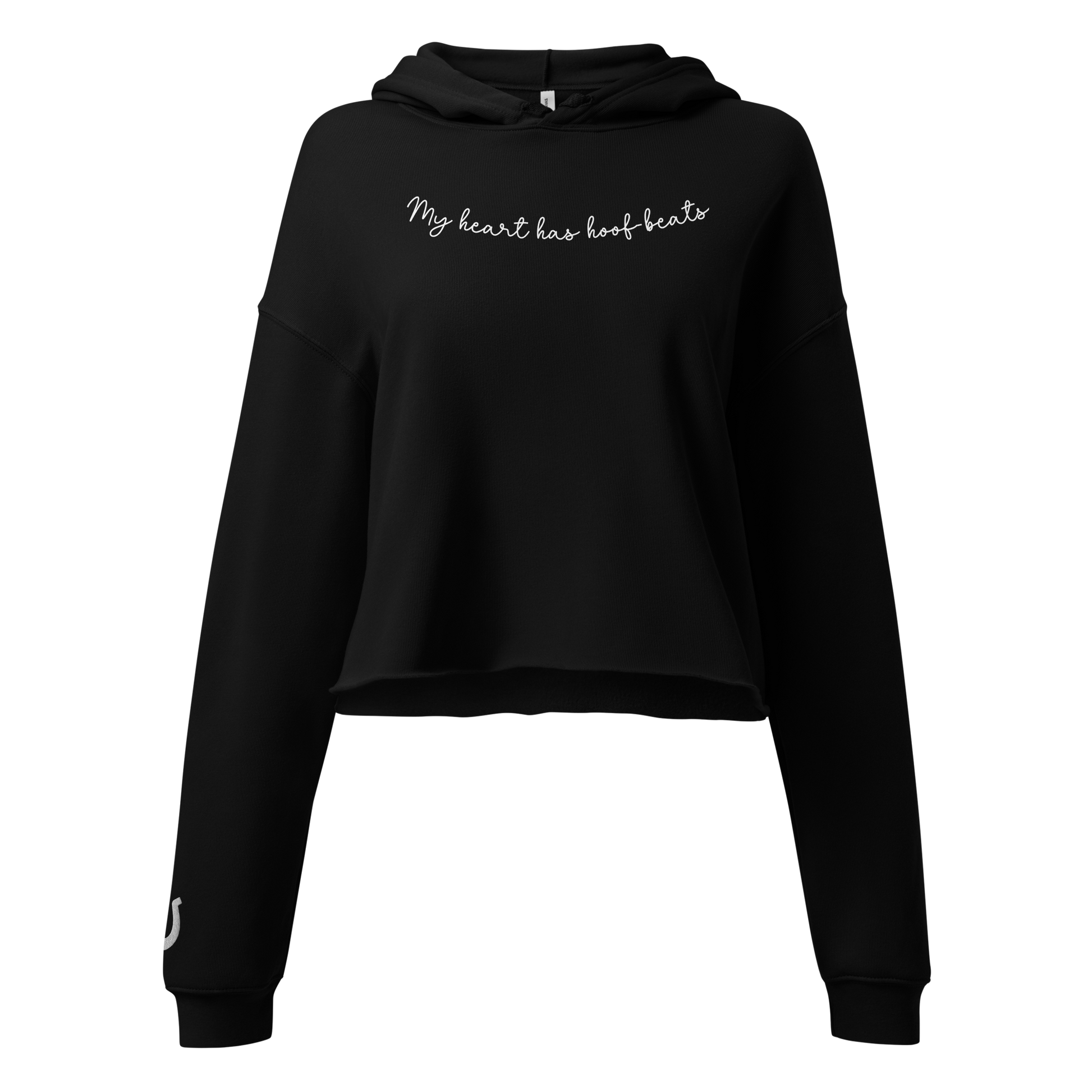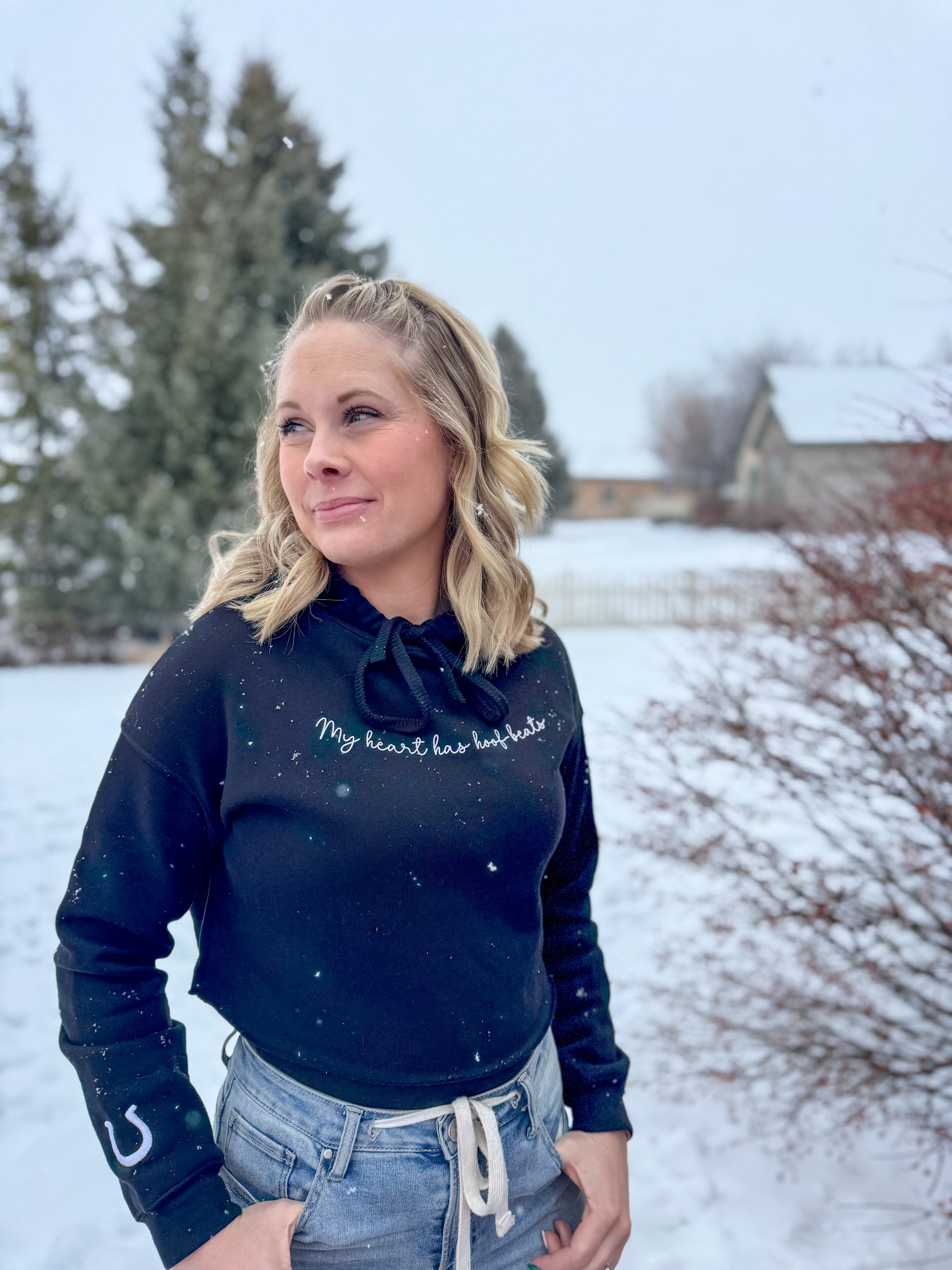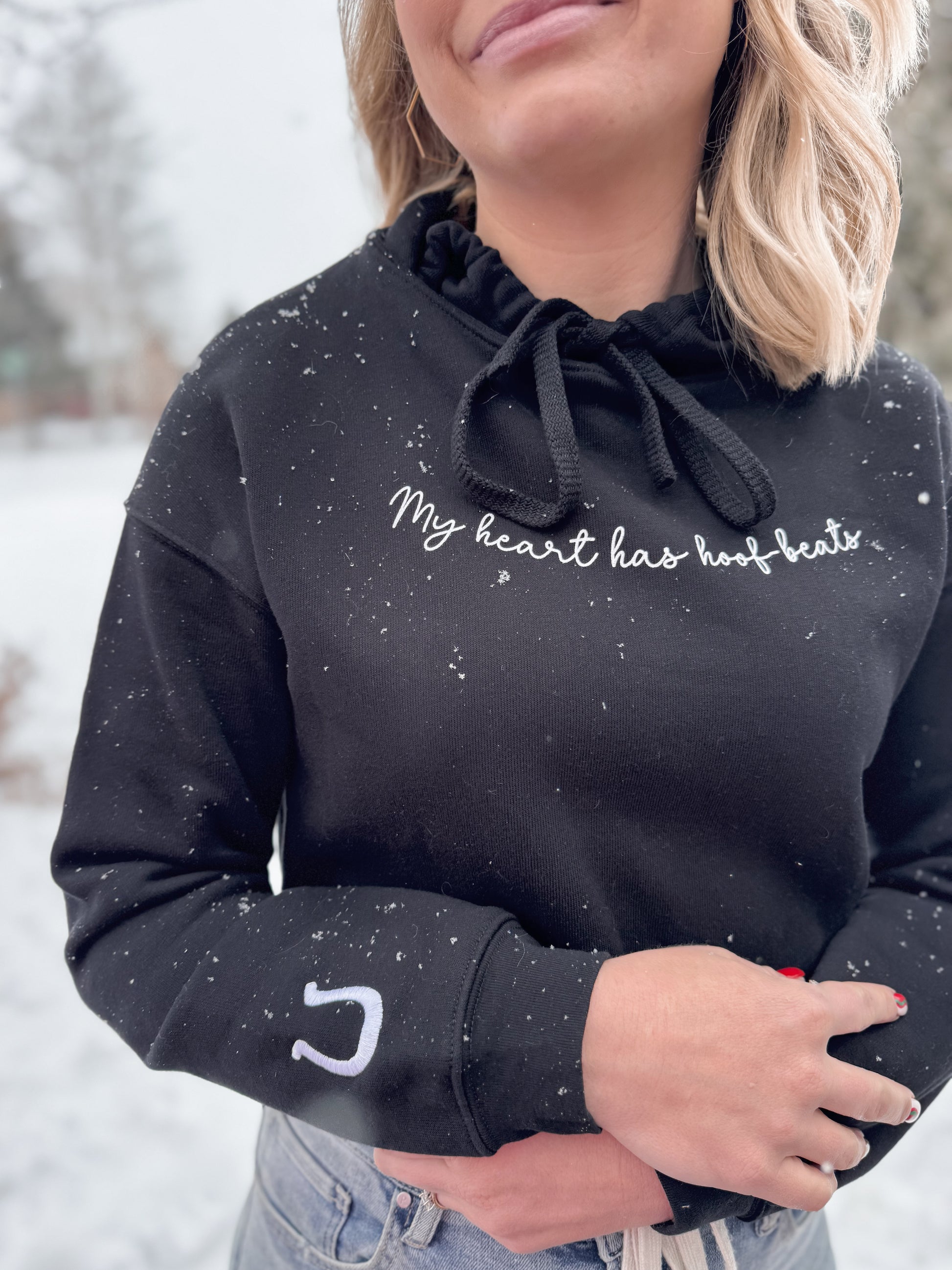 What has your heart? Horses have ours. This special crop hoody includes an embroidered sleeve detail that will remind you of where your heart lies. Pair with a cute pair of jeans or leggings and this will be your go to wardrobe piece! True to size with a raw edge crop seam.